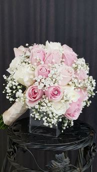 White and pink roses with baby breath