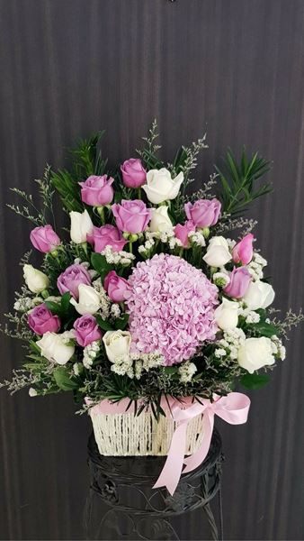 Mixed Roses,Hydrangea, Misty blue, Static go around with greens.