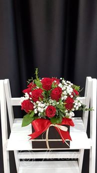 7 Stalk Of Red Roses 1 Gold Roses With Baby Breath arranged in our signature round black box.