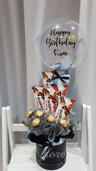 5 kinder beuno, 5 ferrero with 234mm bubble balloon with feather. Wording can be customised. *Put your balloon wording on special instructions before check out*