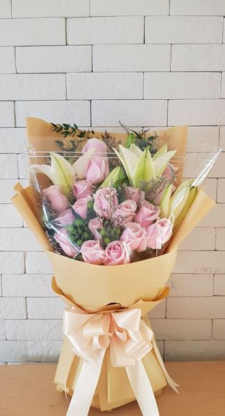 18 pink roses with 2 stalk Lily go with casphia, eucalyptus.